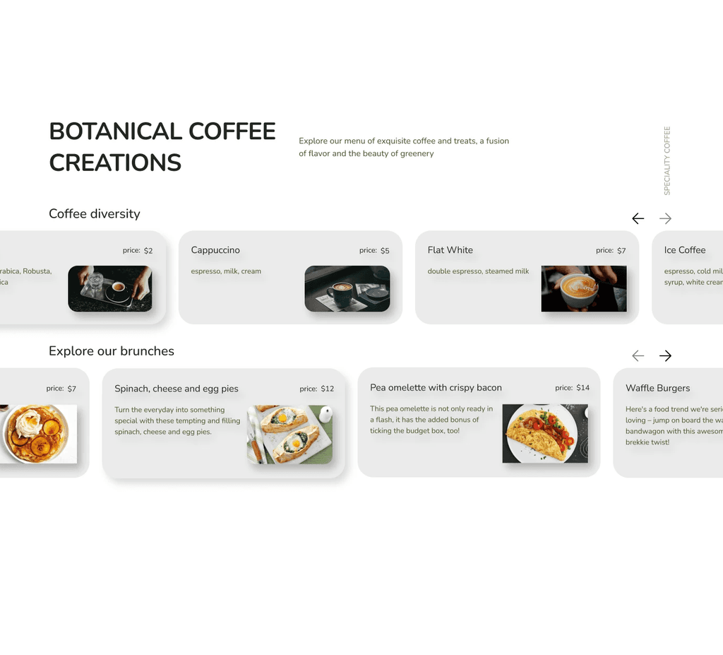 I undertook this project to improve my skills in Figma, focusing on creating a concept for a coffee shop. Through hands-on experience, I strengthened my abilities in creating components, grid layouts, typography, and interactions. Additionally, I learned how to build a design system, choose the right color palette, highlight key elements on a page, and organize topics and features into clear sections.